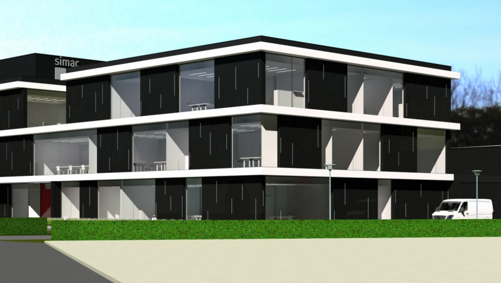 Wedstrijdontwerp voor Simac NV, op de bestaande site in het technologiepark van Haasrode. Het nieuwbouwproject voorziet in een ‘bijna-energie-neutraal’ kantoorgebouw van 3000m² en 500m² magazijnruimte.